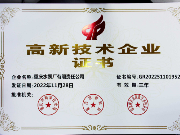 重泵公司“高新技術(shù)企業(yè)”通過復(fù)評認(rèn)定