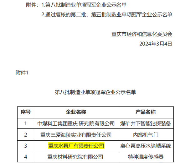 近日,工業和信息化部公布了第八批制造業單項冠軍企業名單,重泵公司成功入選,成為本批重慶入選的4家企業之一,實現了重慶機電集團在國家級制造業單項冠軍企業中“零突破”。這是繼公司獲得國家技術創新示范企業、國家專精特新“小巨人”企業等工業和信息化領域的榮譽后,再次獲得又一項國家級榮譽。