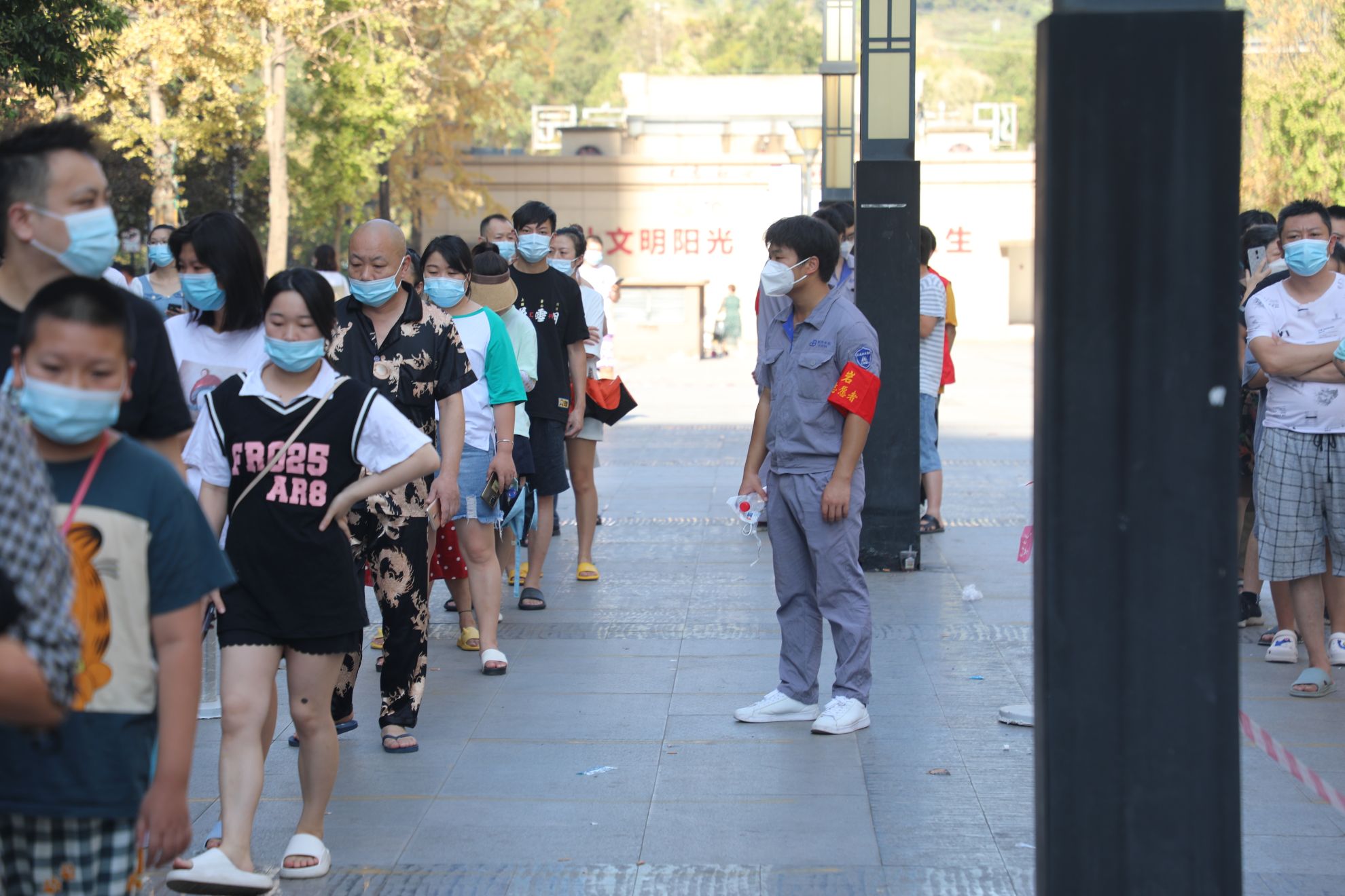 “請大家有序排隊,戴好口罩,保持間隔距離”。8月24日早上5點30分,集合完成的志愿者們在與社區工作人員迅速對接后,就前往各個檢測點各司其職,“志愿紅”成為人群中一道靚麗的風景線。隨著太陽漸漸升起,地表溫度不斷升高,志愿者們不懼高溫,時刻提醒著居民們有序排隊、幫助老人打開核酸檢測碼、為居民解答各種疑惑、提醒注意事項,確保核酸檢測工作推進迅速、進展有序。